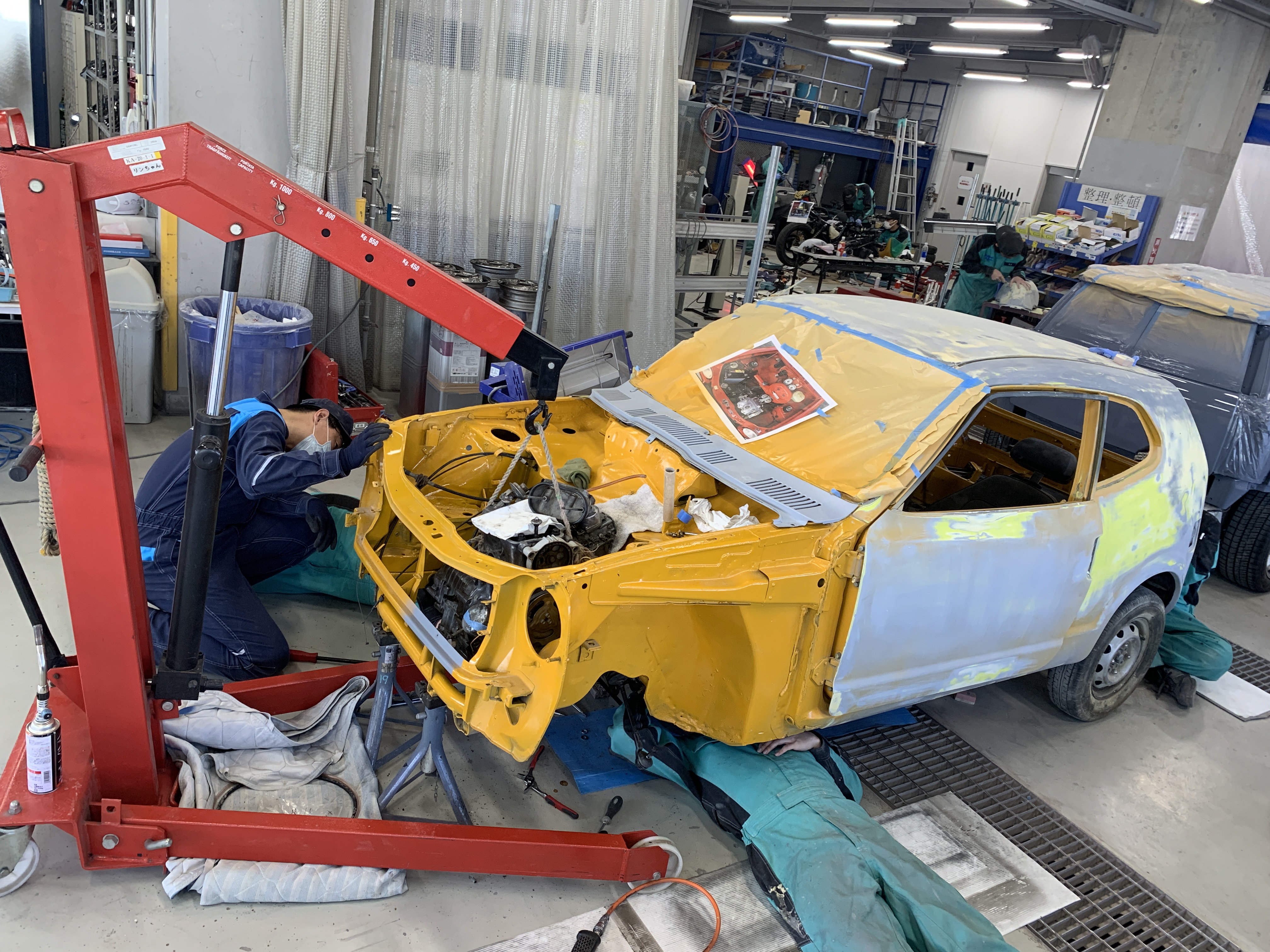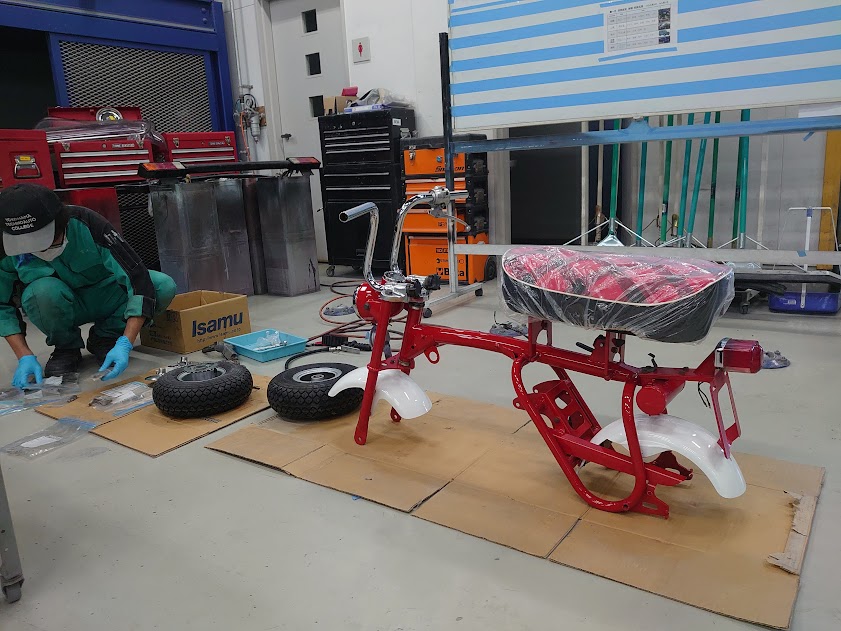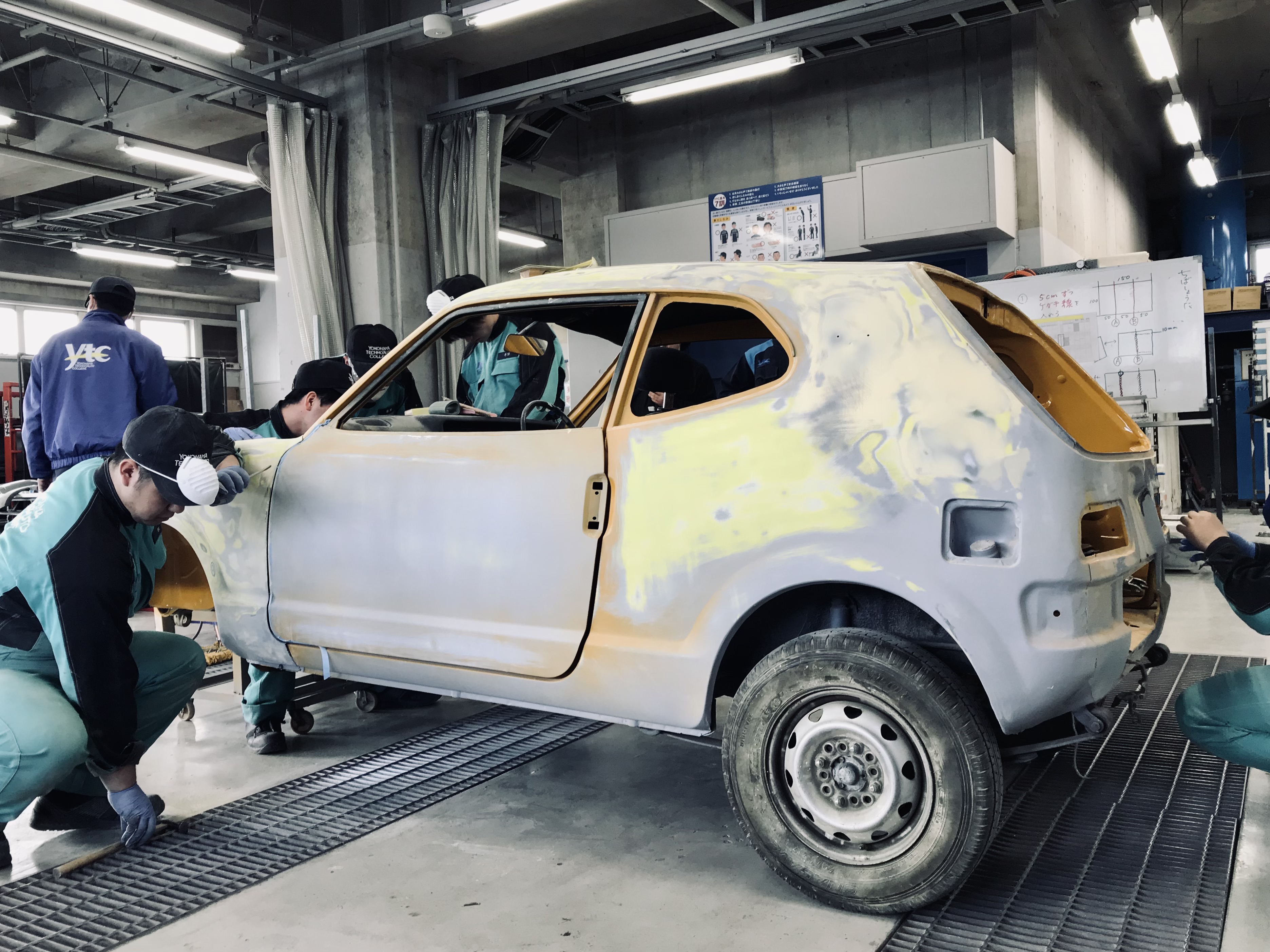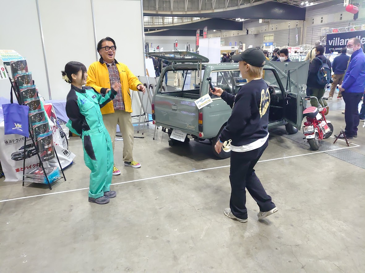 横浜テクノオート専門学校です。国家1級・2級整備士養成課程、さらには鈑金塗装に特化した学科を持つ専門学校です。昨年に続いて2度目の出展となる今回は、1972年式ホンダZを手がけました。
