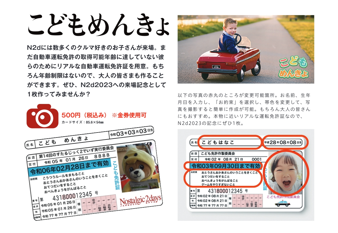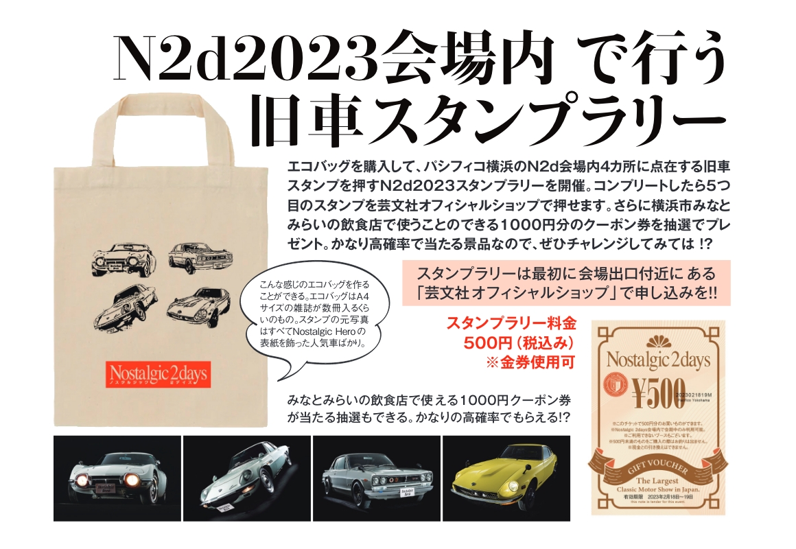 N2dの大人気コンテンツとしておなじみ。読者の皆さまの中から選ばれた車両の走行入場&会場展示は今年も行われます。 初日にはステージ前まで車両を走行移動させ、司会者からのインタビュー。来場者の注目を浴びること間違いなし。 まさに「選ばれし」オーナーのためのもの。その後は2日間、愛車を会場内に展示。来場者との会話を楽しめます。